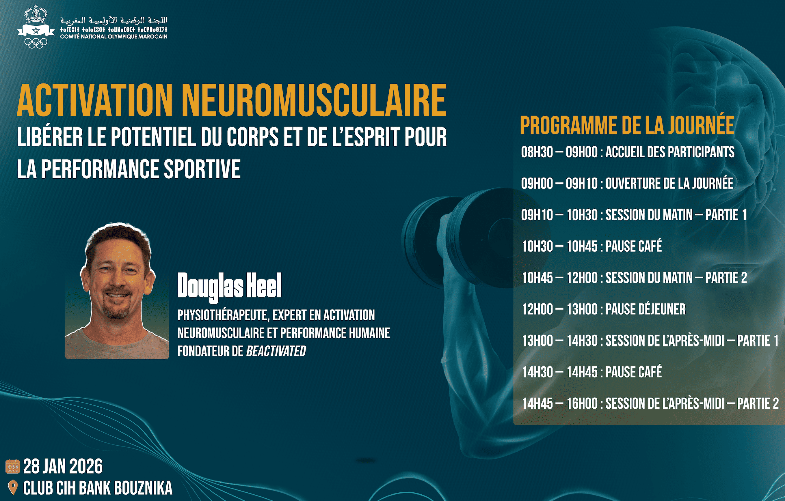 Ce séminaire explore les principes de l’activation neuromusculaire et son impact sur la performance sportive. Il met en évidence les liens entre système nerveux, coordination, puissance et efficacité motrice, afin de mieux comprendre comment libérer le potentiel du corps et de l’esprit au service de la haute performance.