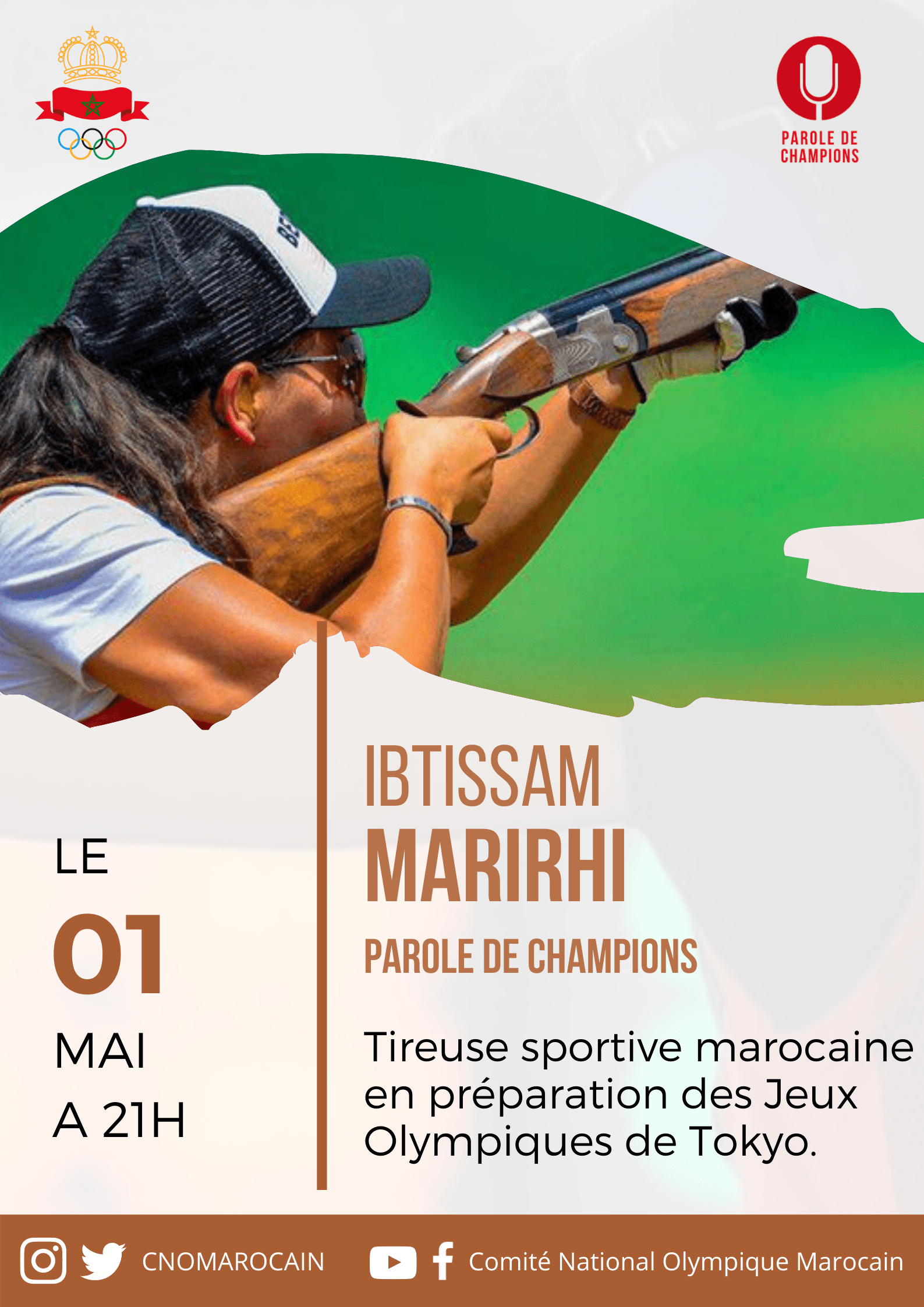 Le Comité National Olympique Marocain a diffusé, le samedi 01 mai 2021, le 13ème épisode de l'émission " Parole de Champions " avec la tireuse marocaine, Ibtissam MARIRHI.