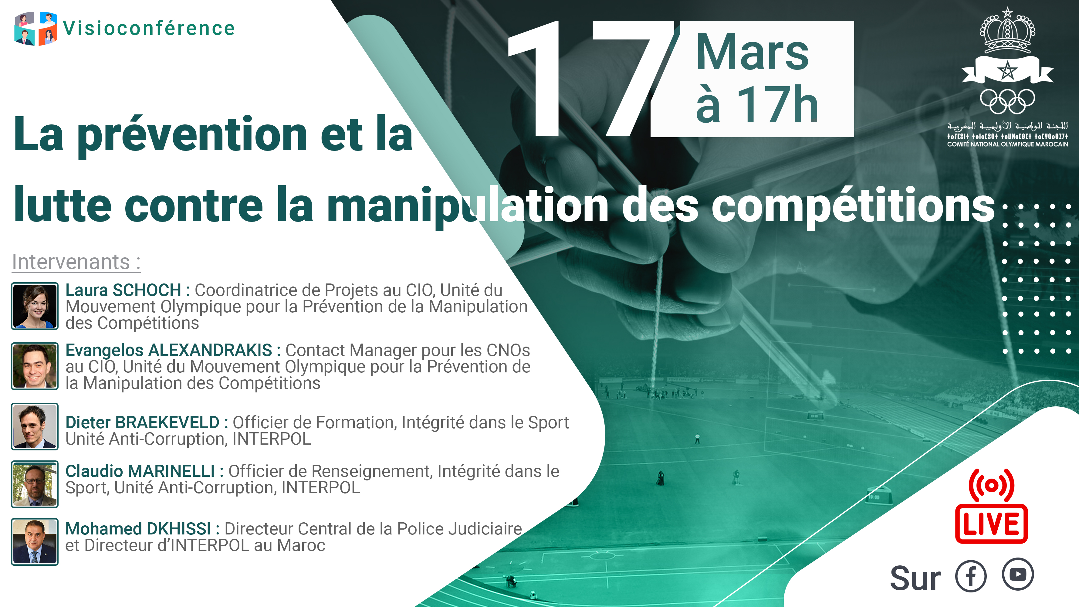 L'Académie Olympique Digitale Marocaine du CNOM a organisé le mercredi 17 mars 2021 à 17h, une visioconférence sur le thème : «La prévention et la lutte contre la manipulation des compétitions".