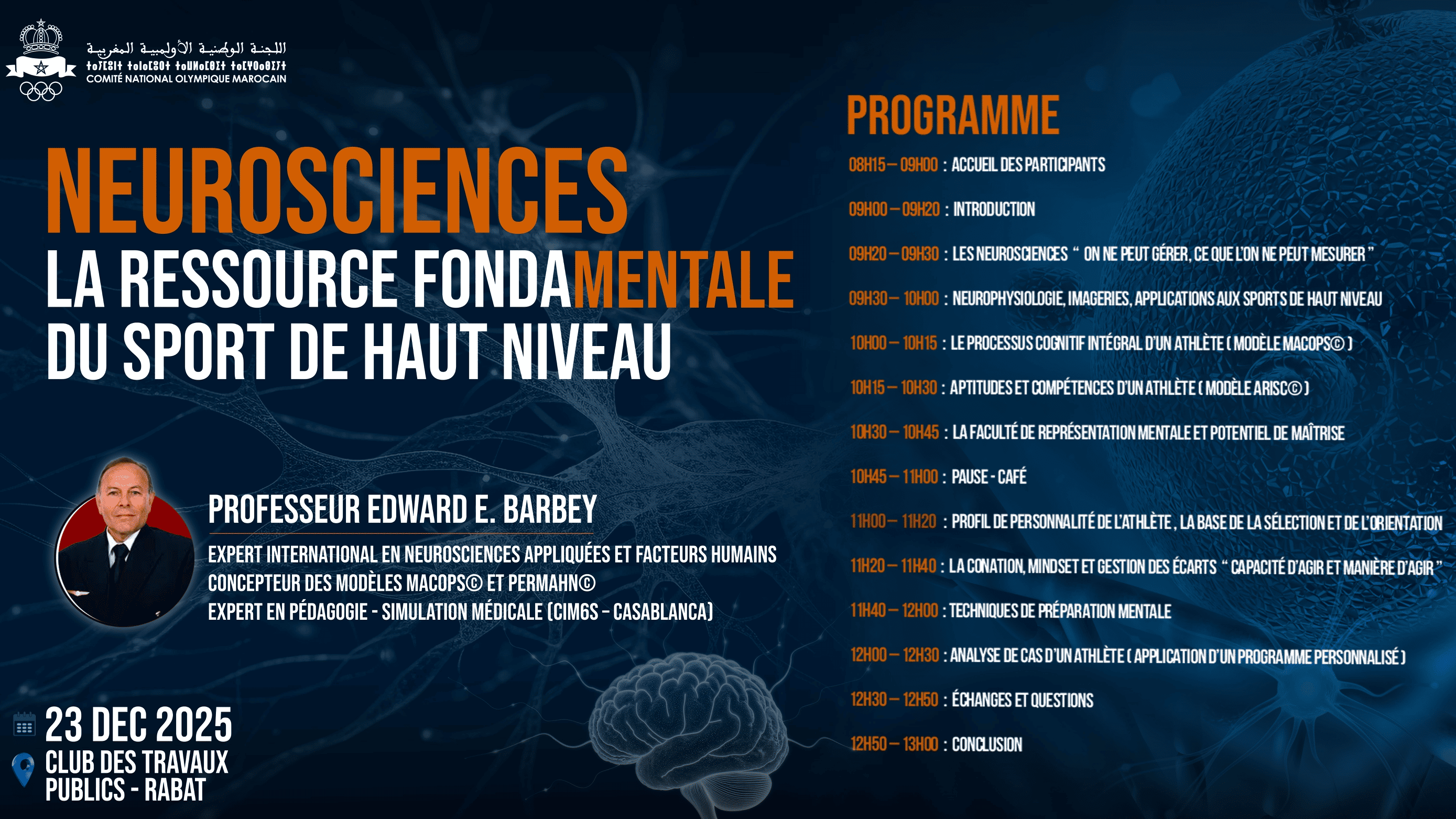 Ce séminaire met en lumière l’apport des neurosciences dans le sport de haut niveau. Il explore le rôle du cerveau dans la performance, la prise de décision, la gestion des émotions et l’optimisation du potentiel. Une approche scientifique et opérationnelle au service des entraîneurs et des acteurs de la haute performance.